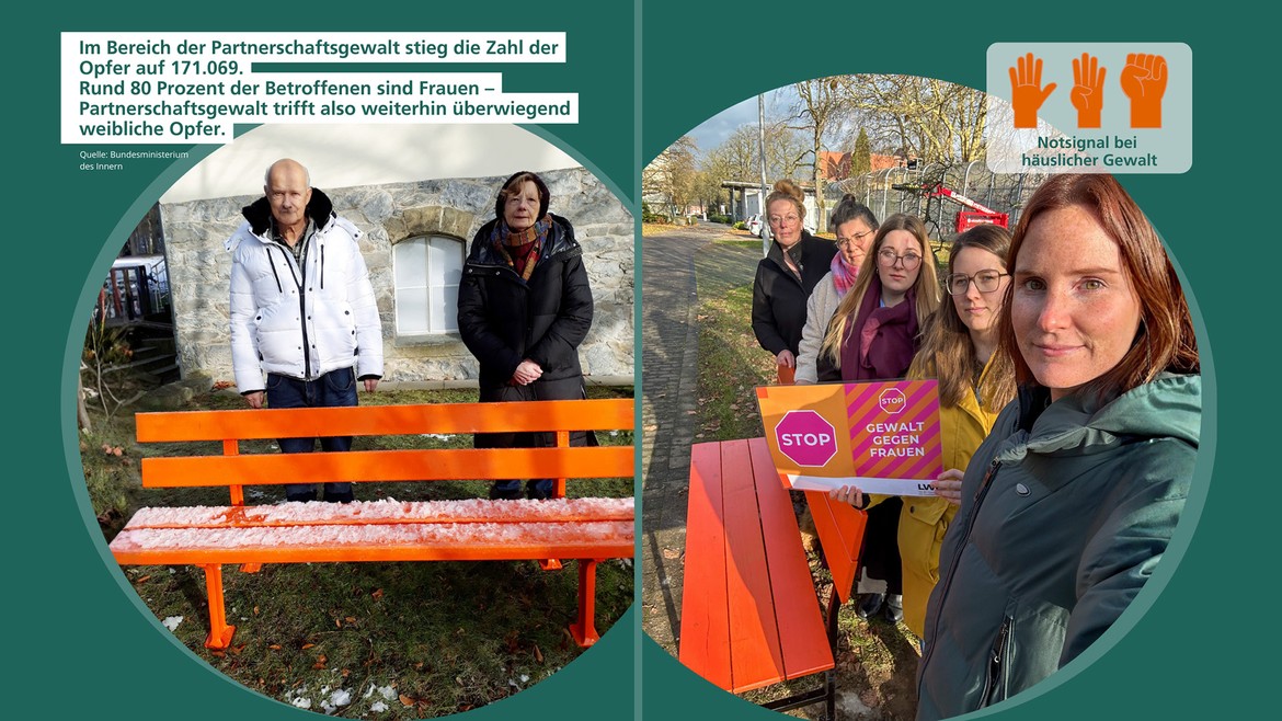 Unter dem Motto „Mach mit: Setz dich ein gegen Gewalt an Frauen“ haben wir auf unseren Geländen orangene Bänke aufgestellt. Die Farbe Orange steht international als Symbol im Einsatz gegen Gewalt an Frauen und Mädchen.